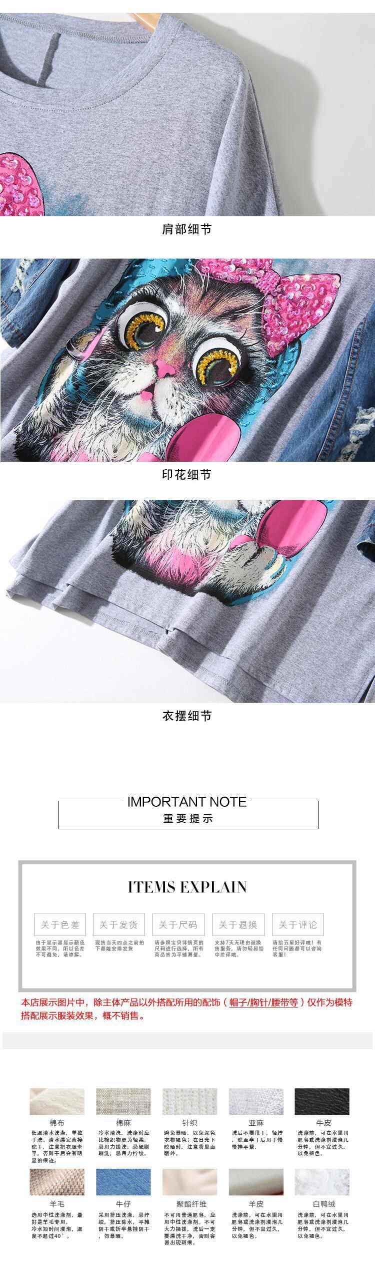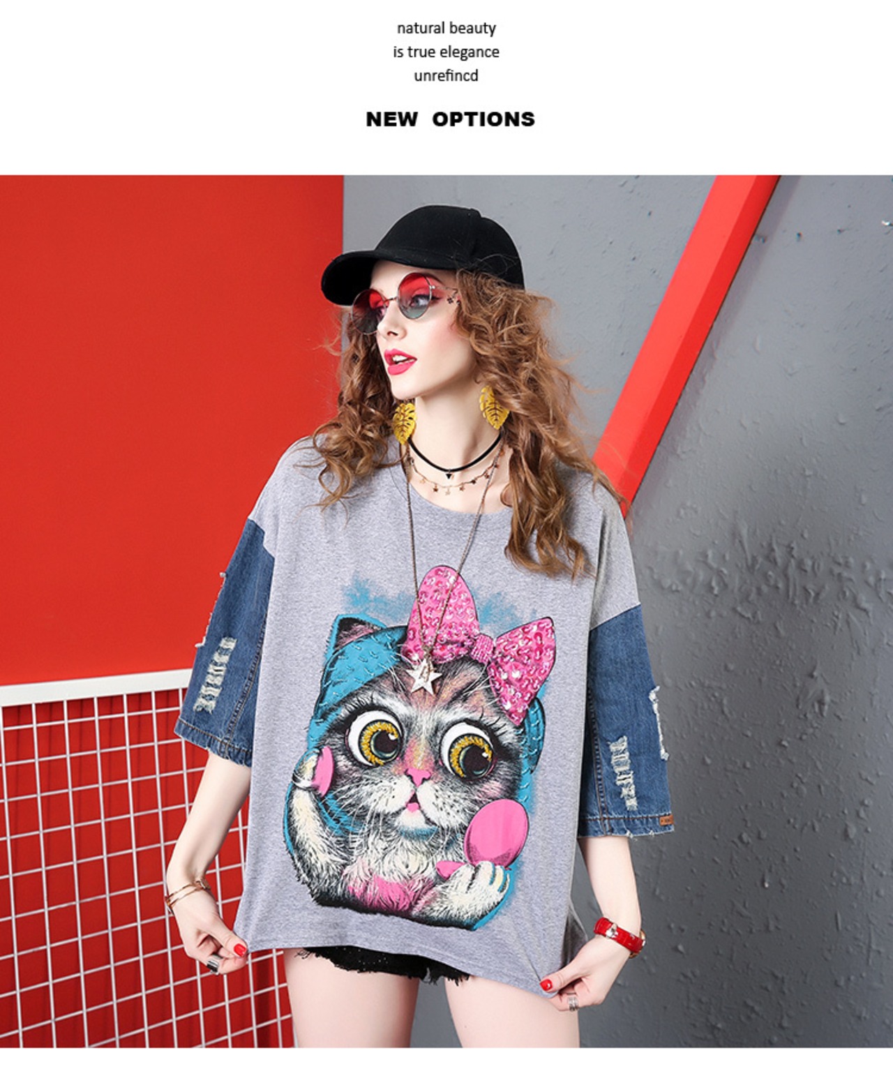 Discount Store Mall Counters Withdrawal Women's Tail Clearance Nail Beads Cartoon Cat Loose T-Shirt Tシャツ ビーズ missry39327252878 | guttiy