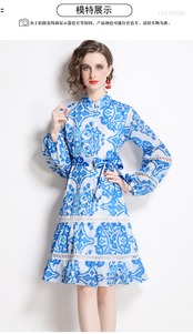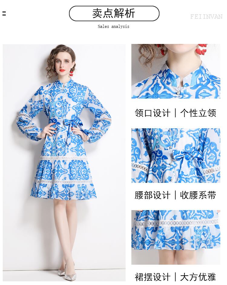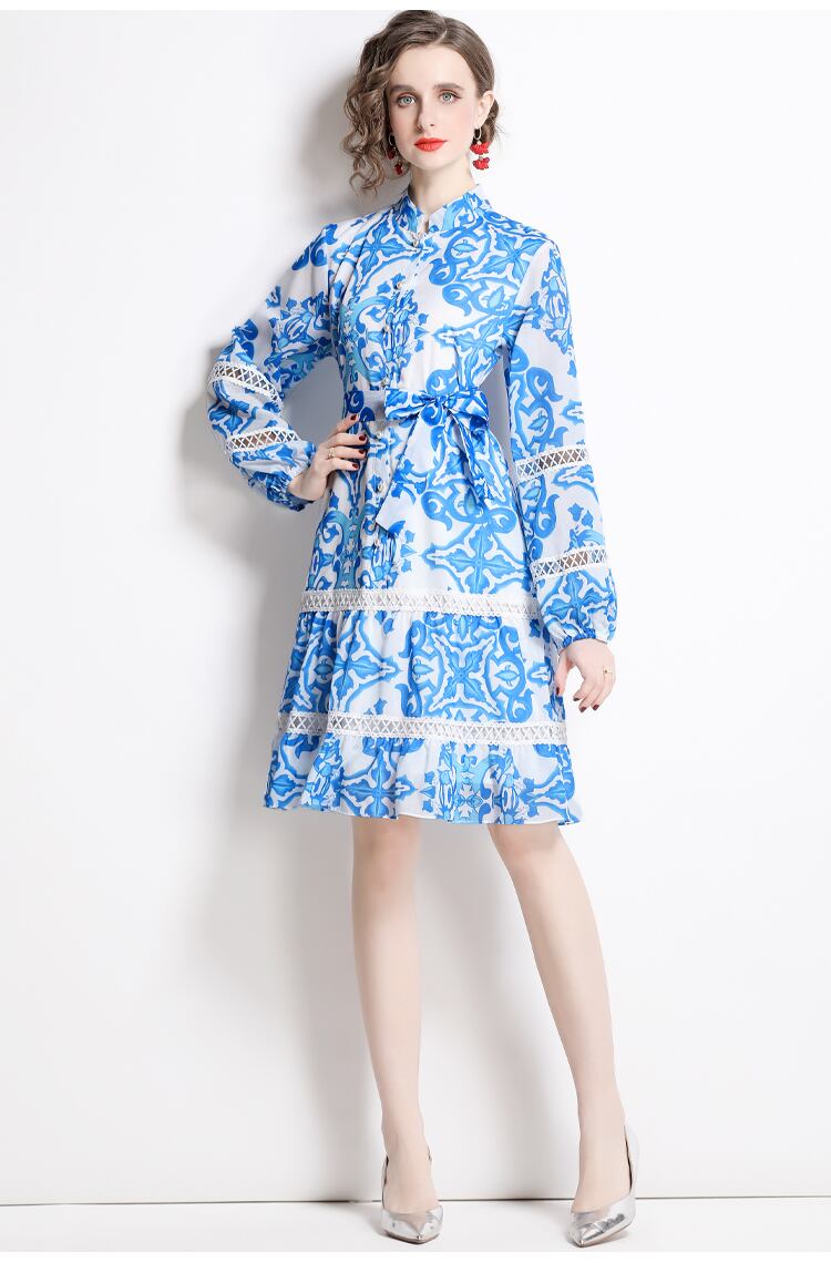 Discount store mall counters withdrawn women's clothing tail goods clearance spring and summer women's blue and white porcelain print hollow long-sleeved stand-up collar skirt ロング ホワイト ブルー スプリング 春物 サマー 夏物 スカート missry82772030554 | guttiy