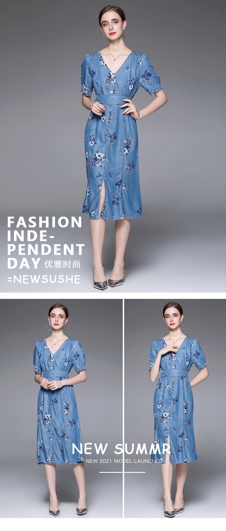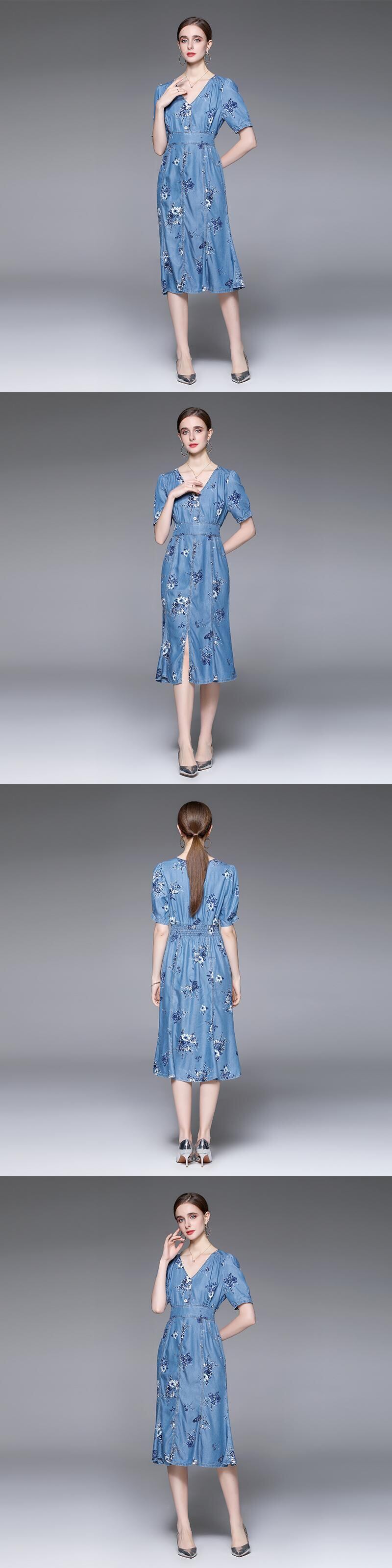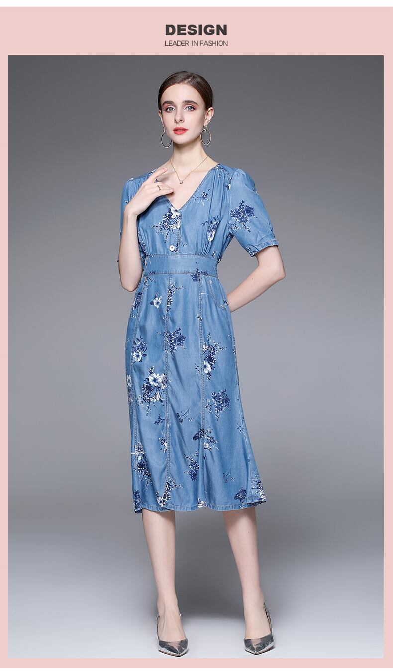 Discount store mall counters withdrawn women's clothing tail goods clearance show thin waist V-neck printed denim dress プリント Vネック missry46915705993 | guttiy