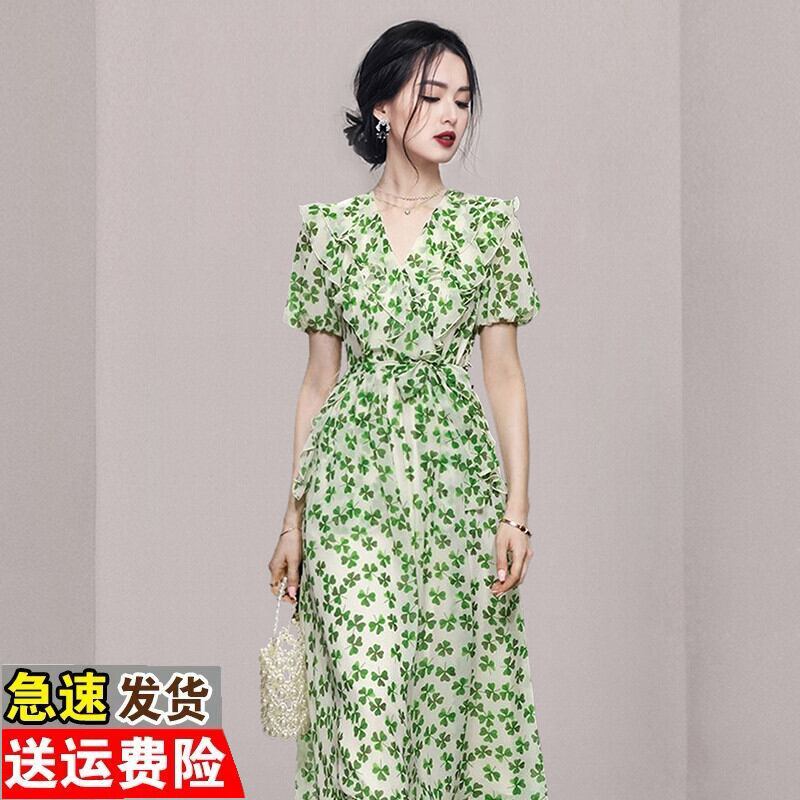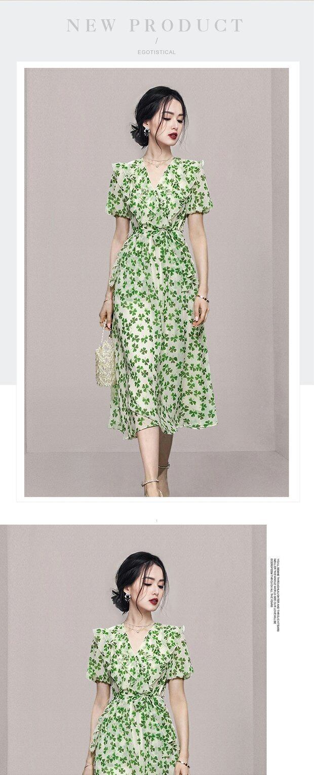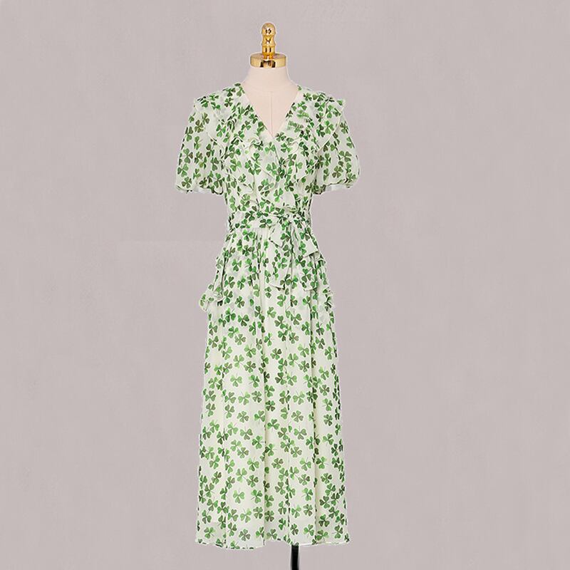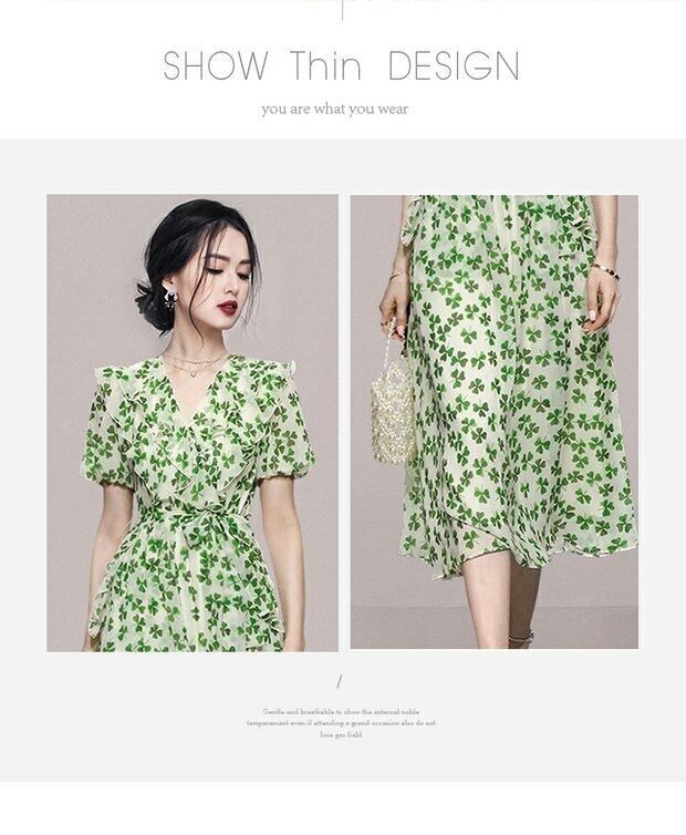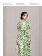 Discount store mall counters withdrawn women's clothing tail goods clearance puff sleeves waist slim green floral long dress ロング 花柄 スリム グリーン missry83709784112 | guttiy
