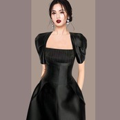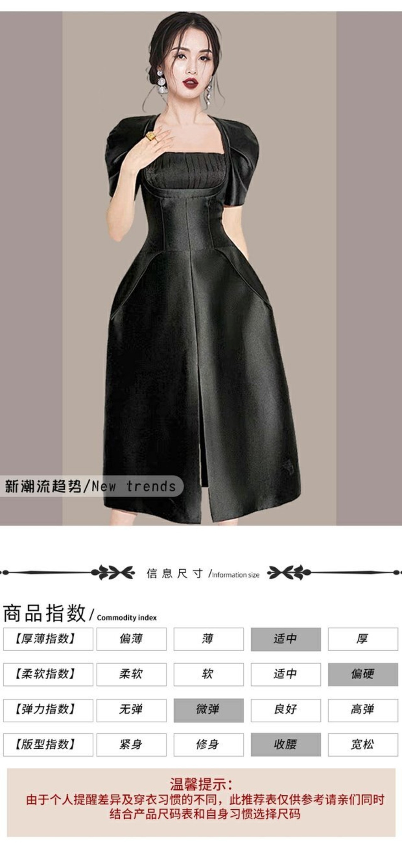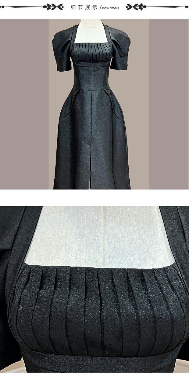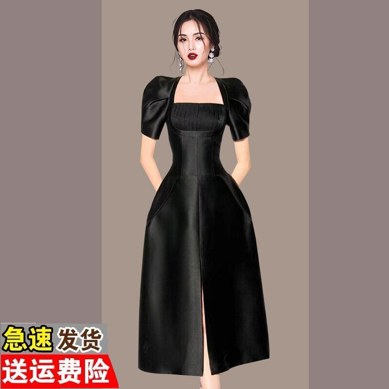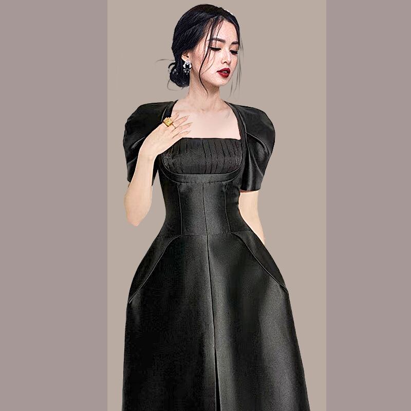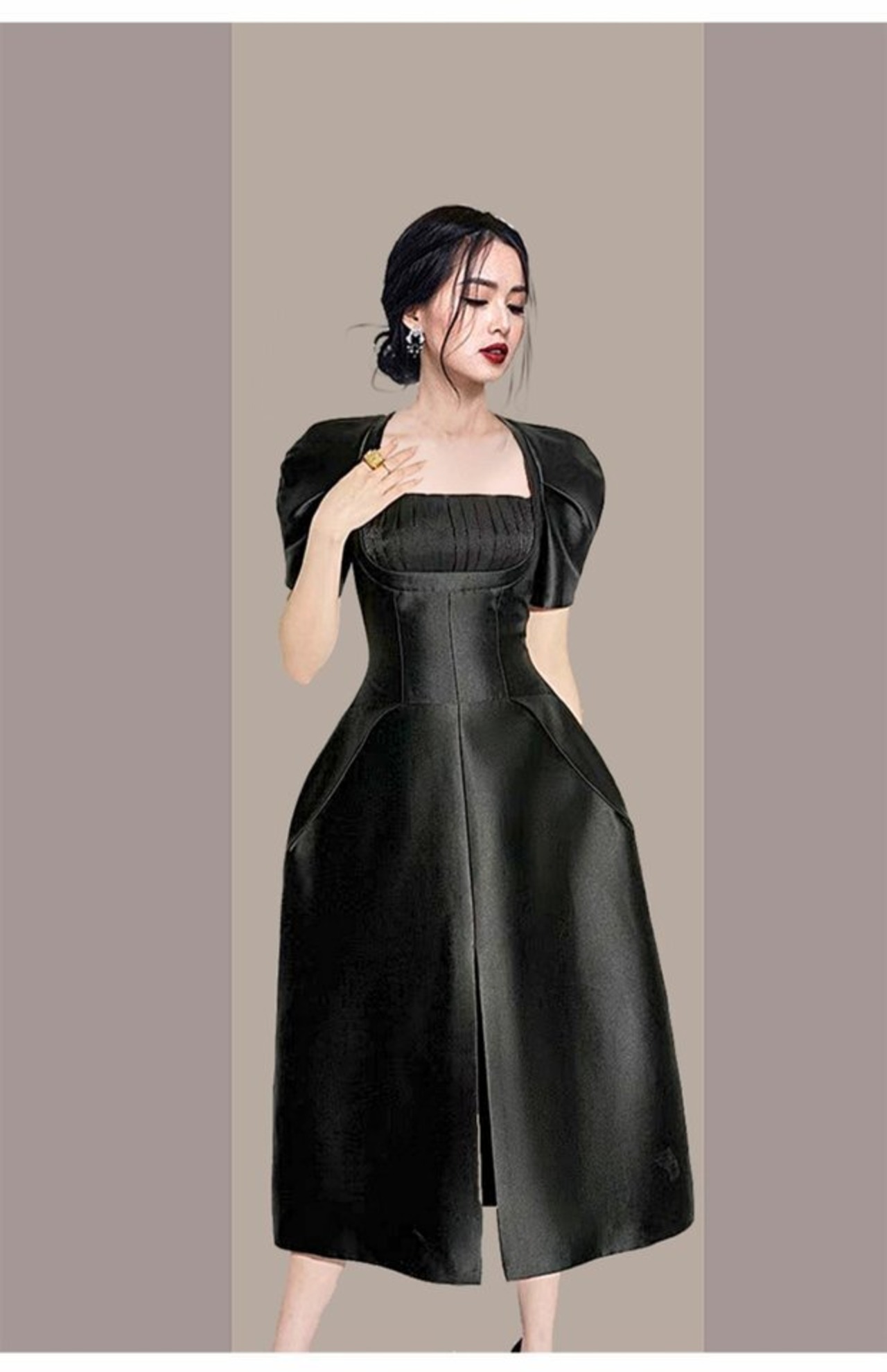 Discount Store Mall Counters Withdrawal Women's Ends Clearance Square Neck Puff Sleeves Waist Slit Slim Black Dress ブラック スリム スクウェア missry44433045136 | guttiy