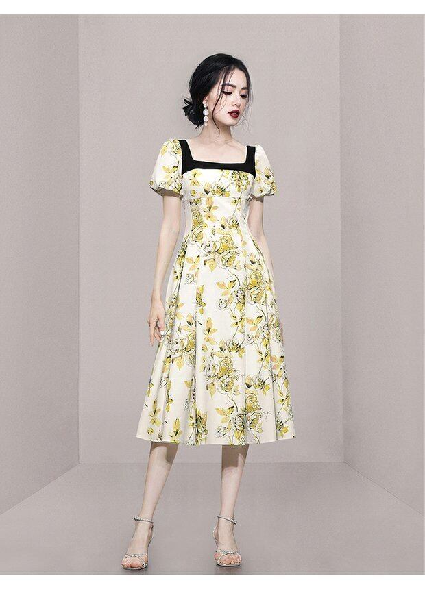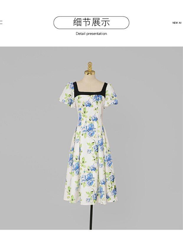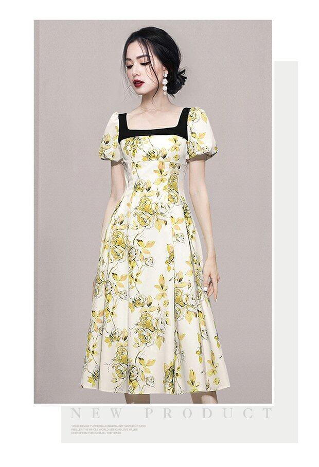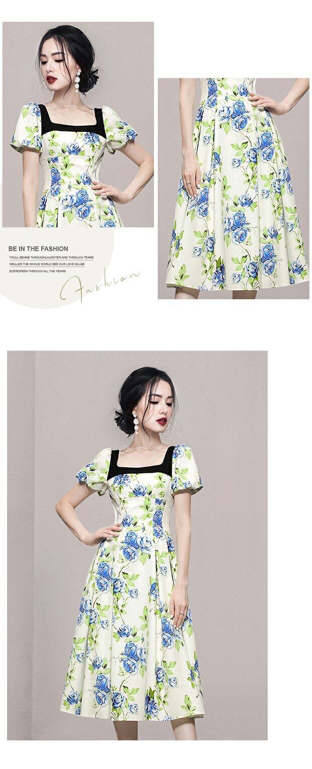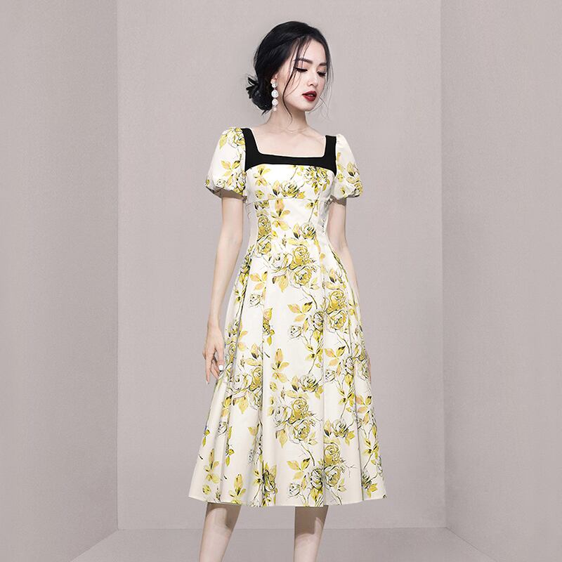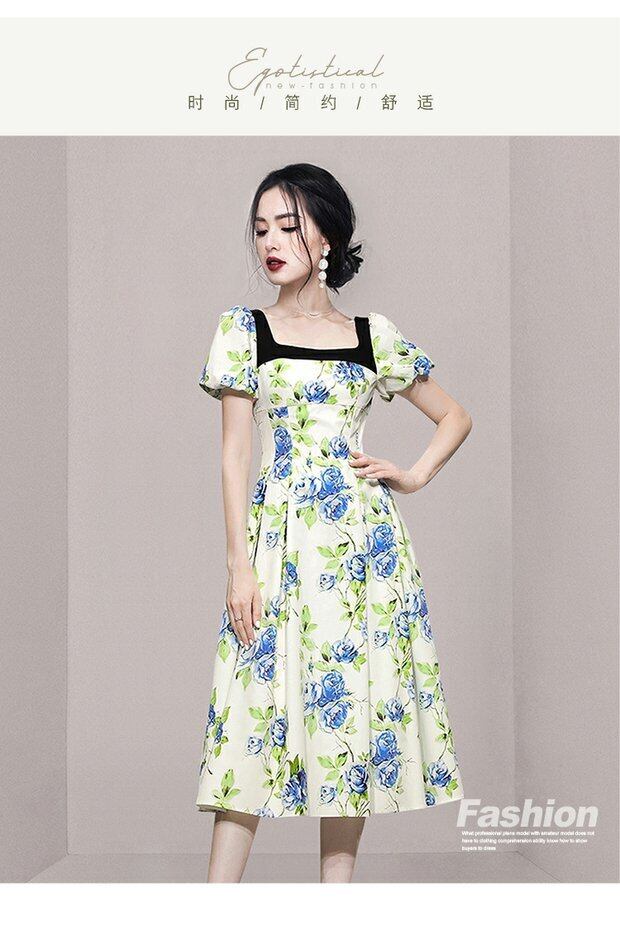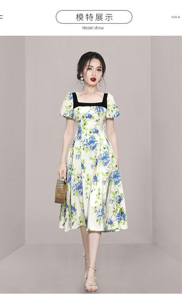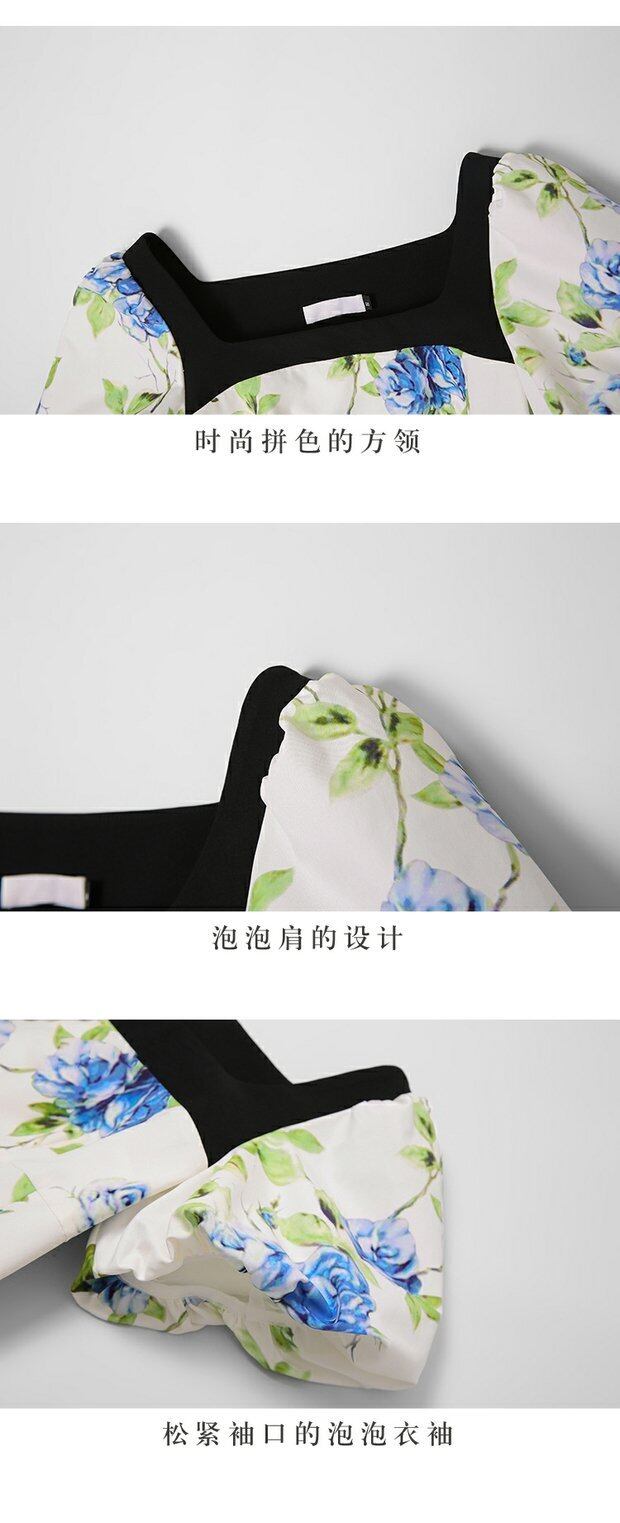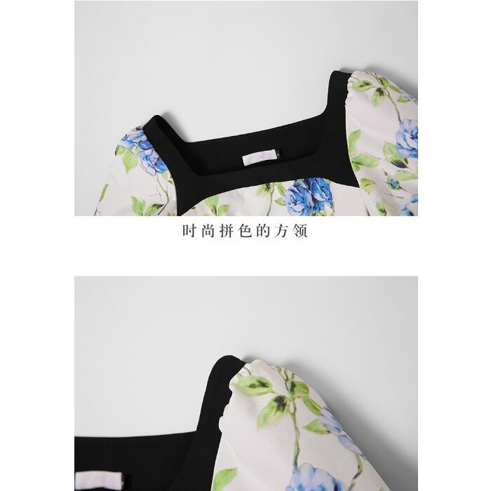 Discount Store Mall Counters Withdrawal Women's Ends Clearance Puff Sleeves Waist Print French Tea Break Dress missry16801805293 | guttiy