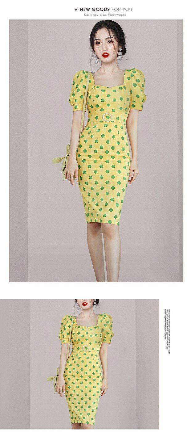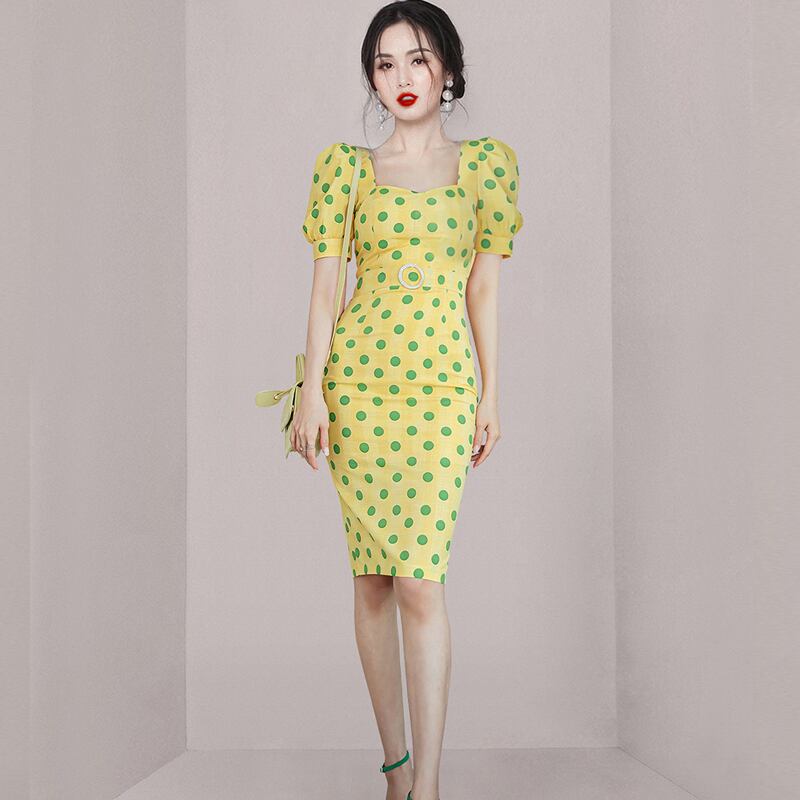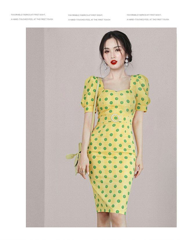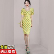 Discount store mall counters withdrawn women's clothing tail goods clearance, waist and thin square neck puff sleeve hip dress スクウェア missry47892484417 | guttiy